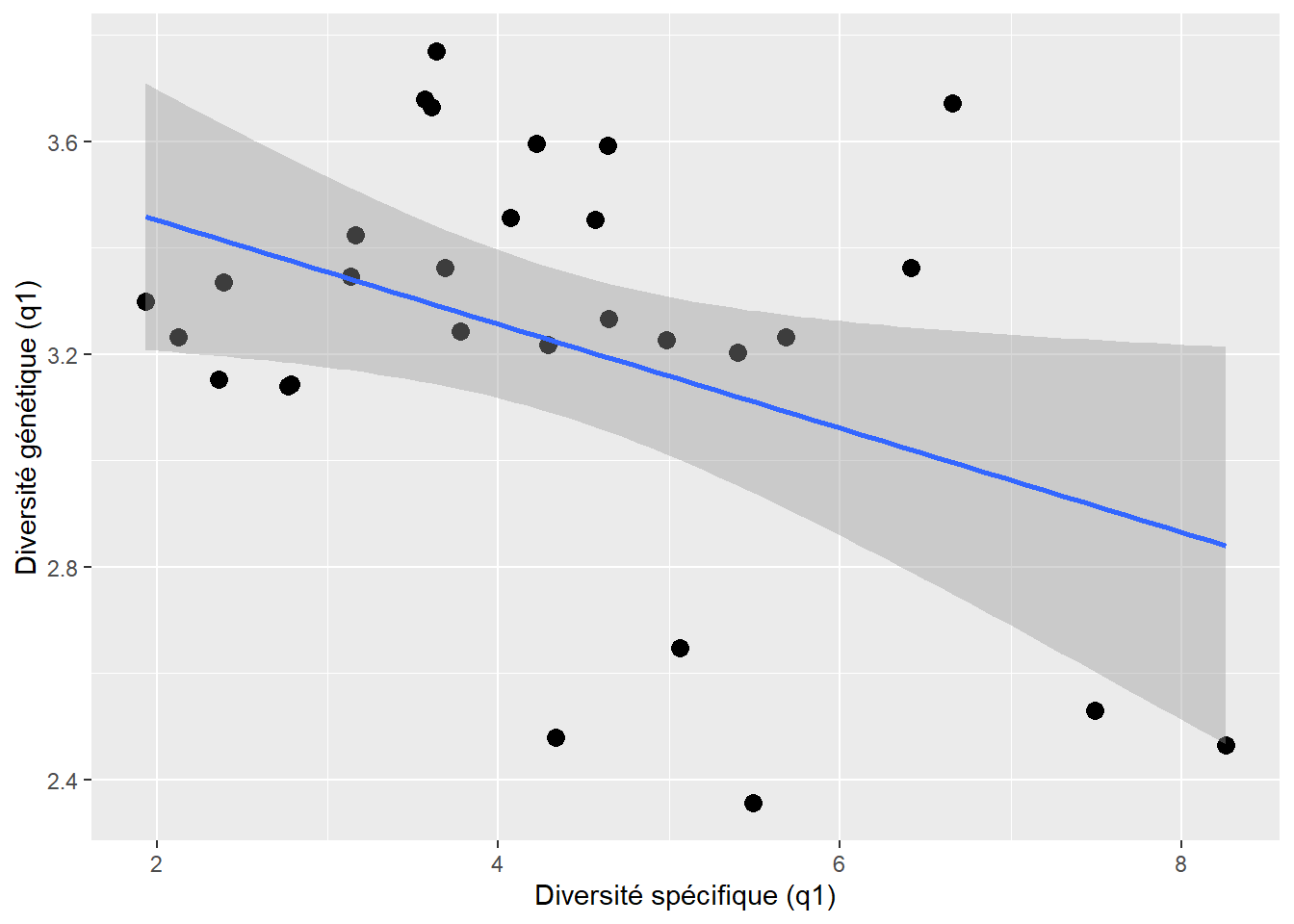 labs(x = "Diversité spécifique (q1)", y = "Diversité génétique (q1)")`geom_smooth()` using formula = 'y ~ x'